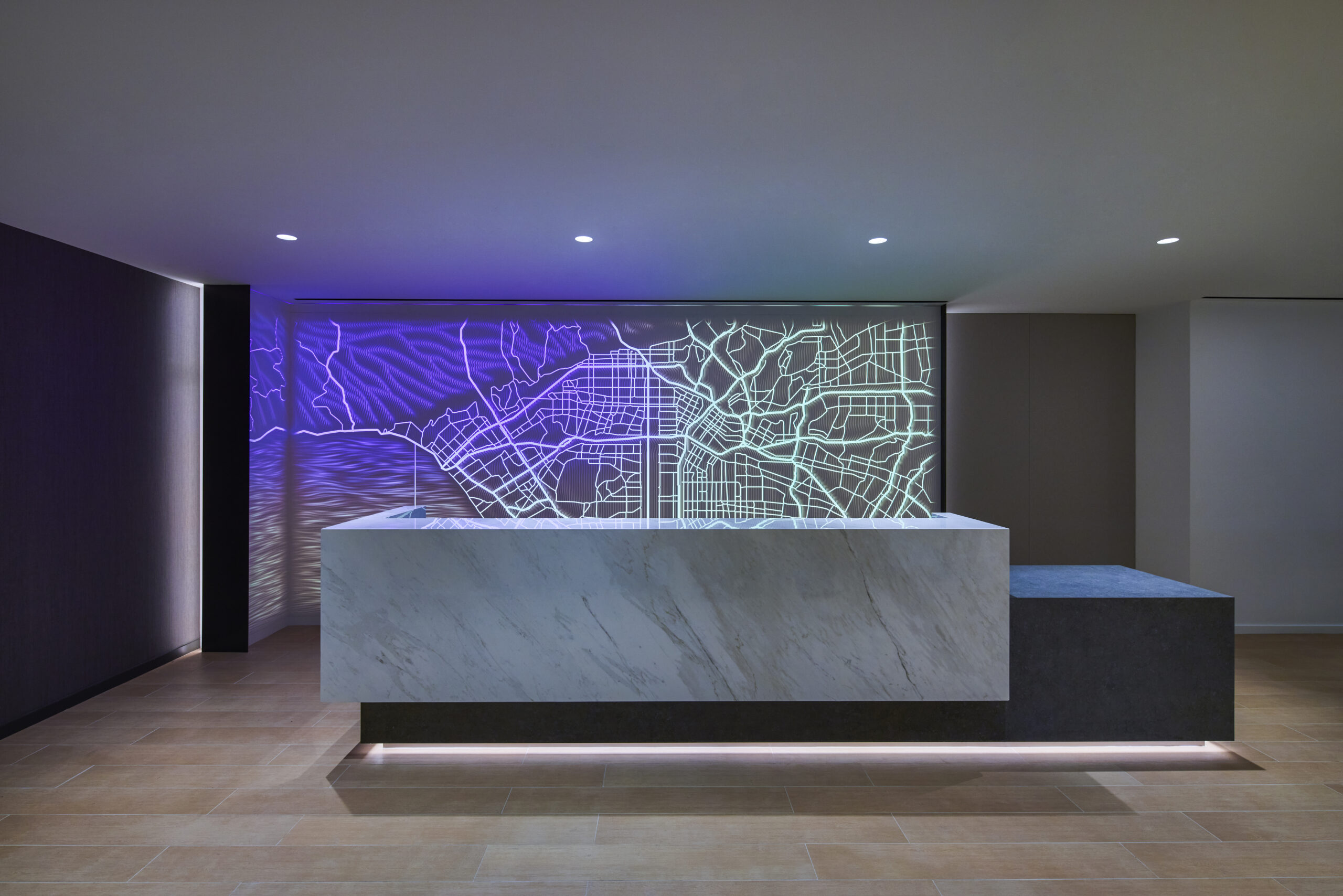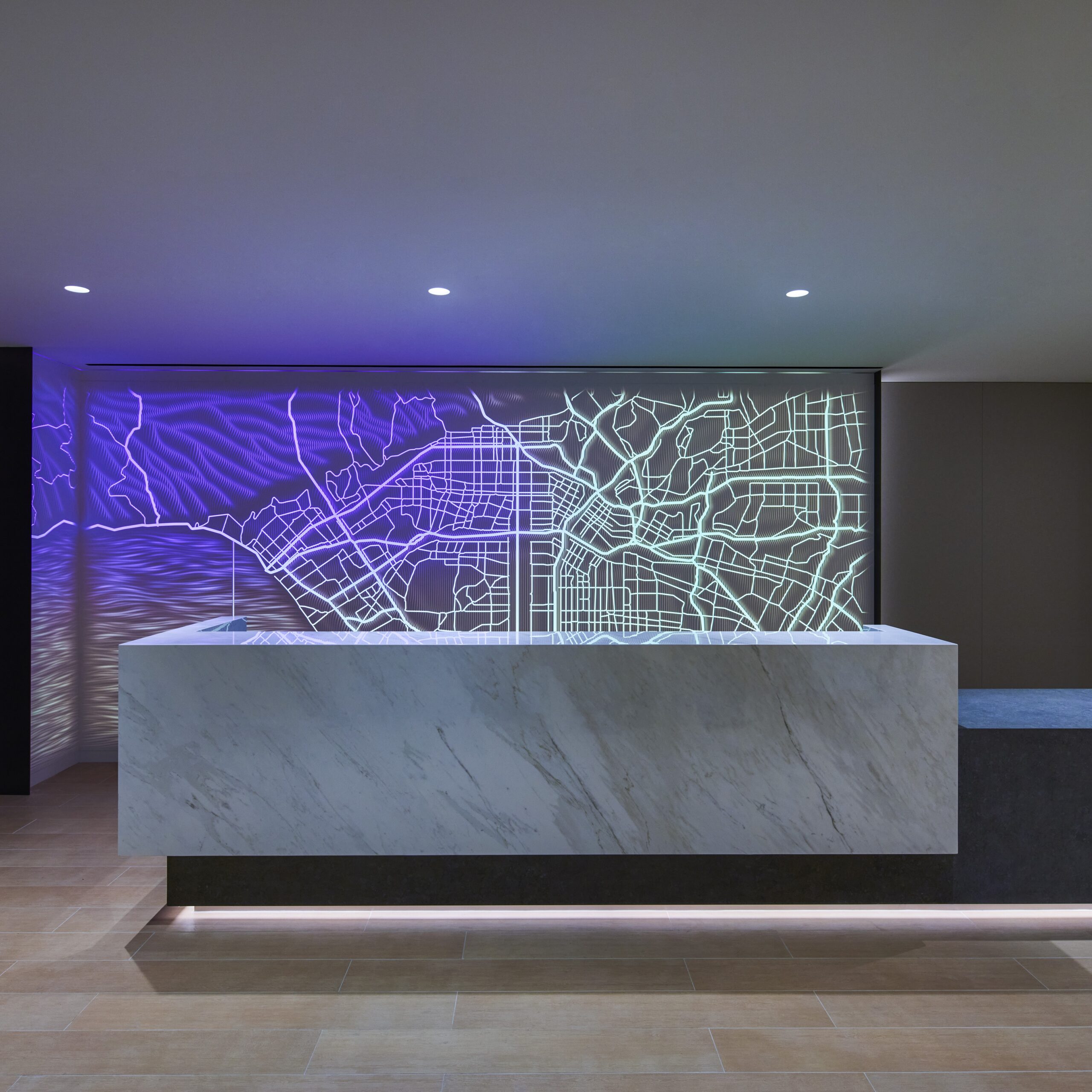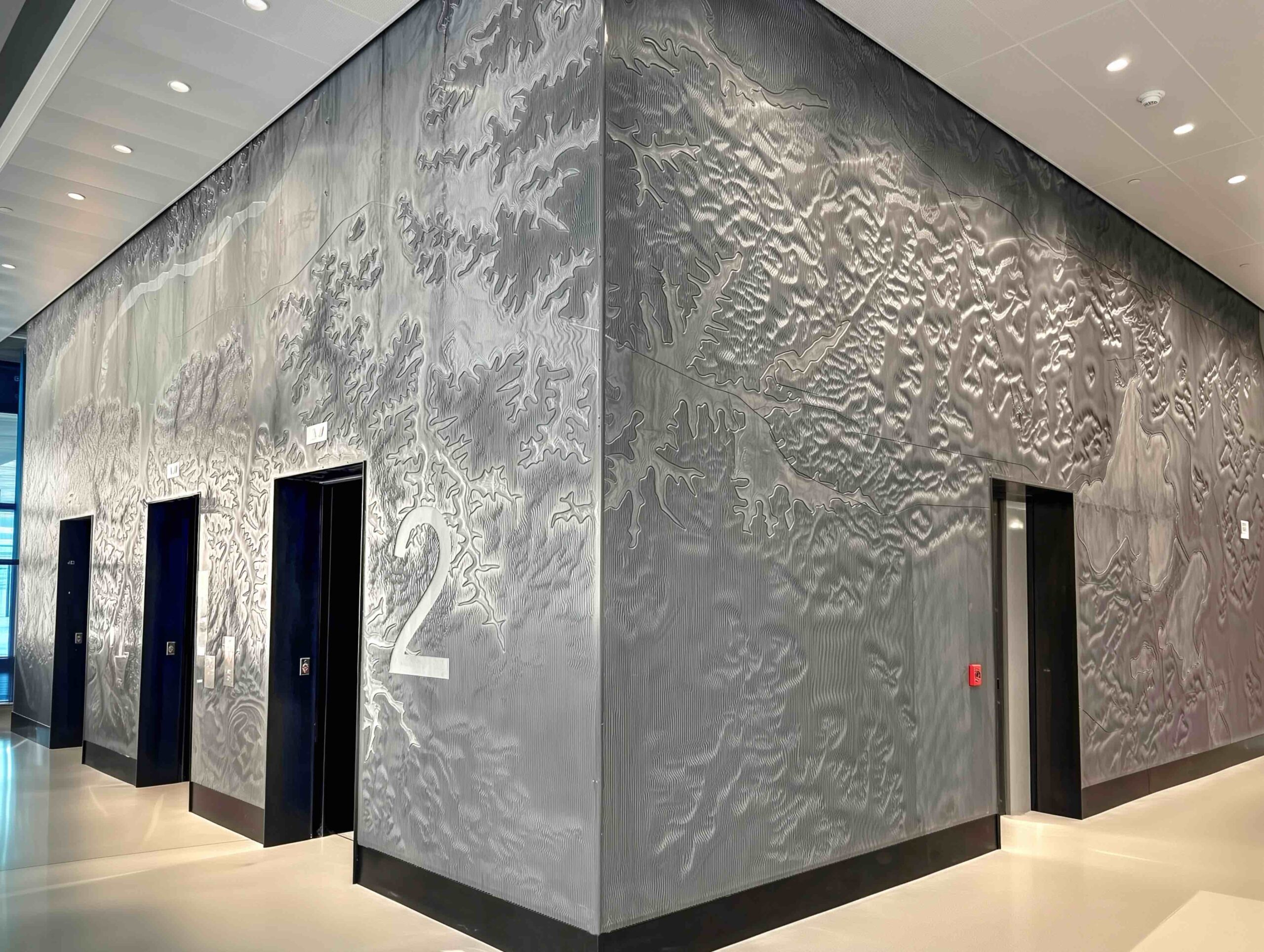 M|R Walls is a unique 3D patented technology wall application designed with Corian® Solid Surface for interior and exterior use. Designs are created as an uninterrupted design. Each wall panel is carved and labeled, then delivered and assembled on-site with no visible seams. Bonded together with matching adhesive, the walls are impervious to mold, virus, and bacteria. They are completely waterproof and offer a finished solution in one step. No painting, no sanding.