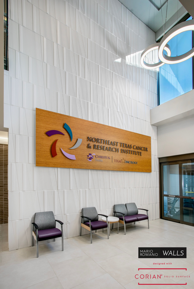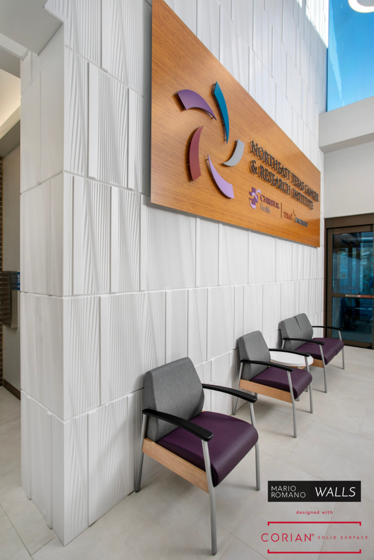 What began as a standard healthcare design with a brown brick specification evolved into a standout architectural feature thanks to a bold shift in material and vision. The final result is a custom carved Corian® wall installation by M|R Walls that delivers bold texture, clean lines, and high performance functionality tailored to the healthcare environment.