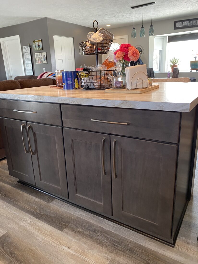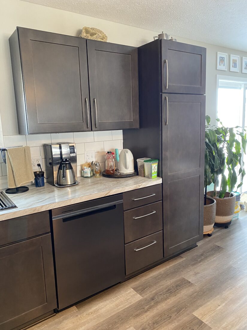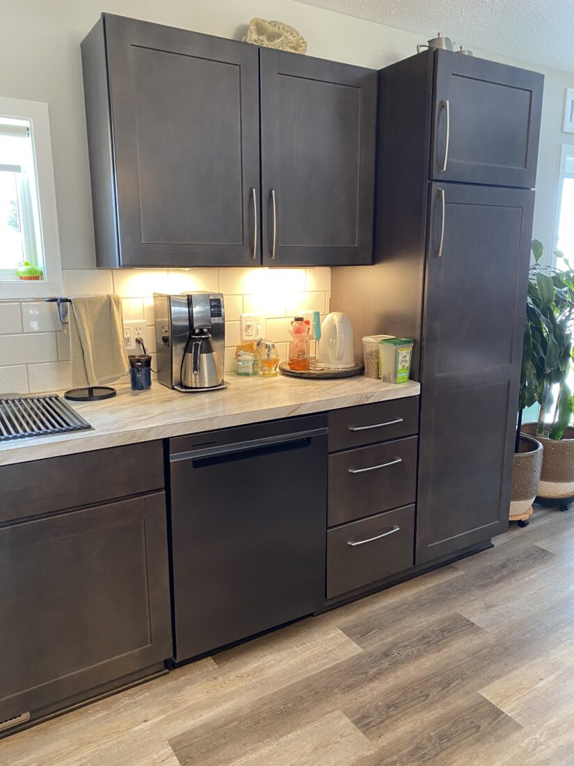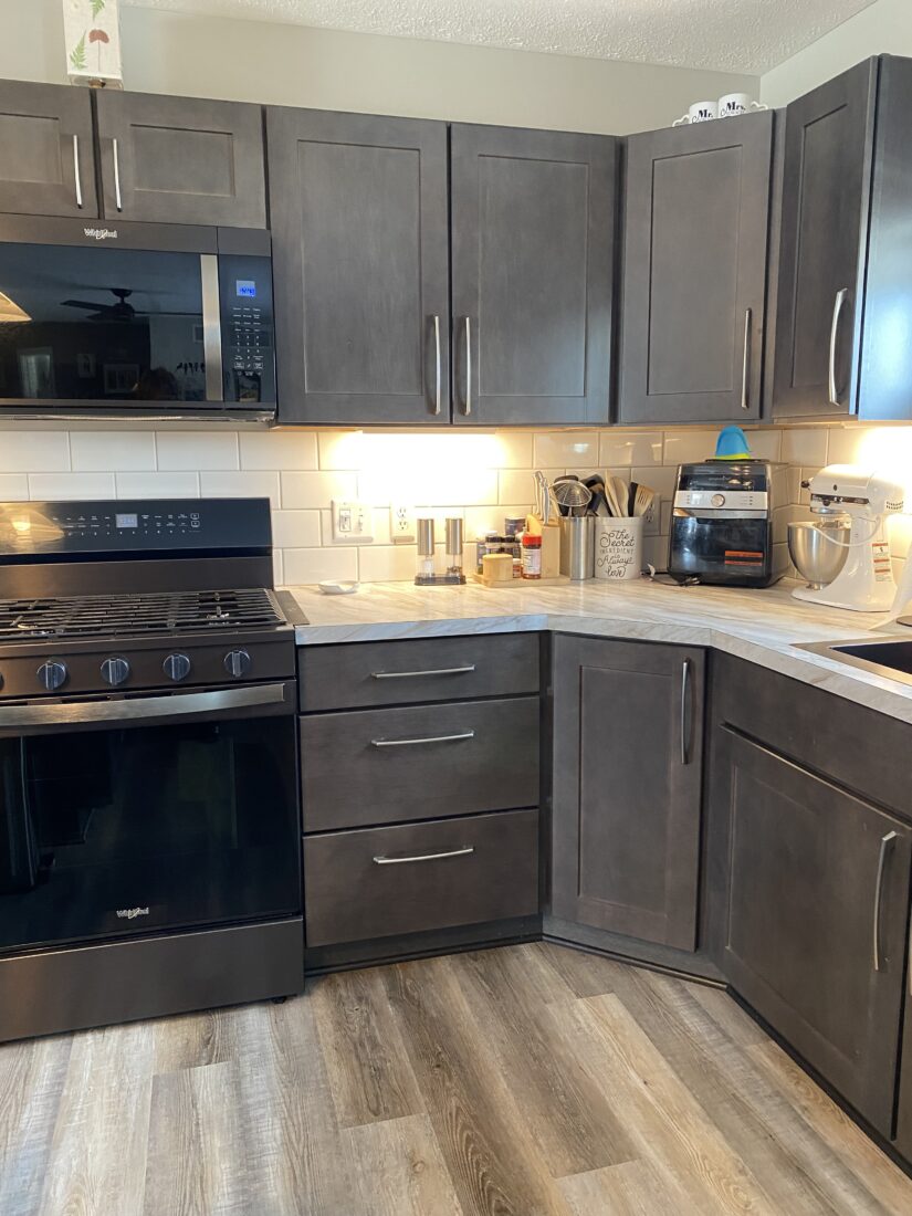 The kitchen showcases Merillat Classic Tolani Maple in Basalt, a deep, rich finish that enhances the natural character of maple. The Tolani door style offers a transitional look with simple lines, making it a versatile choice for everyday living. Paired with light countertops and a classic subway tile backsplash, the darker cabinetry creates contrast and visual balance throughout the space.