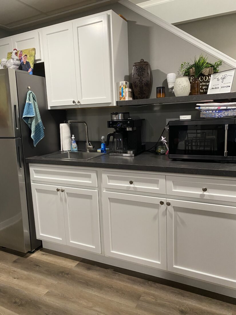 The basement features Fabuwood Metro in Frost, introducing a bright and streamlined aesthetic. The flat-panel Metro door style keeps the look modern and uncluttered, while the Frost finish helps maintain an open, inviting feel in the lower level.
