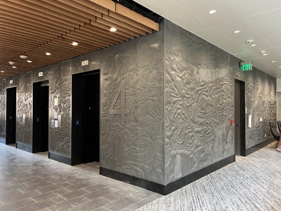 LMN Architects approached MR Walls with a bold question. Could the entire Wisconsin River be carved across seven floors of elevator cores? The vision called for a fully custom topographic design, a different pattern on each floor, and a continuous story that connected the building from the ground up. In total, more than 5000 square feet of carved Corian Solid Surface wraps through the elevator cores at the center of this LEED Platinum campus.