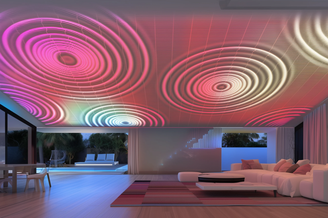 Evening transforms the space into a fully immersive lighting feature integrated into the architecture.
