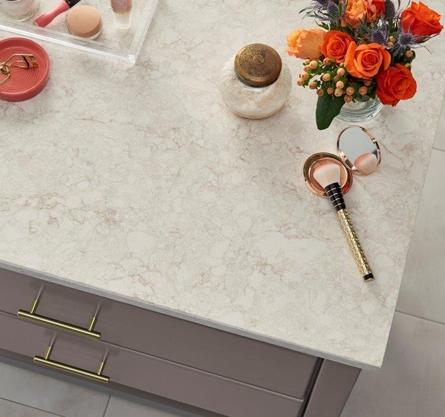 Corian Solid Surface works especially well in bathrooms and utility spaces where integrated sinks and durability matter, while Quartz remains a top choice for kitchens and entertainment areas.